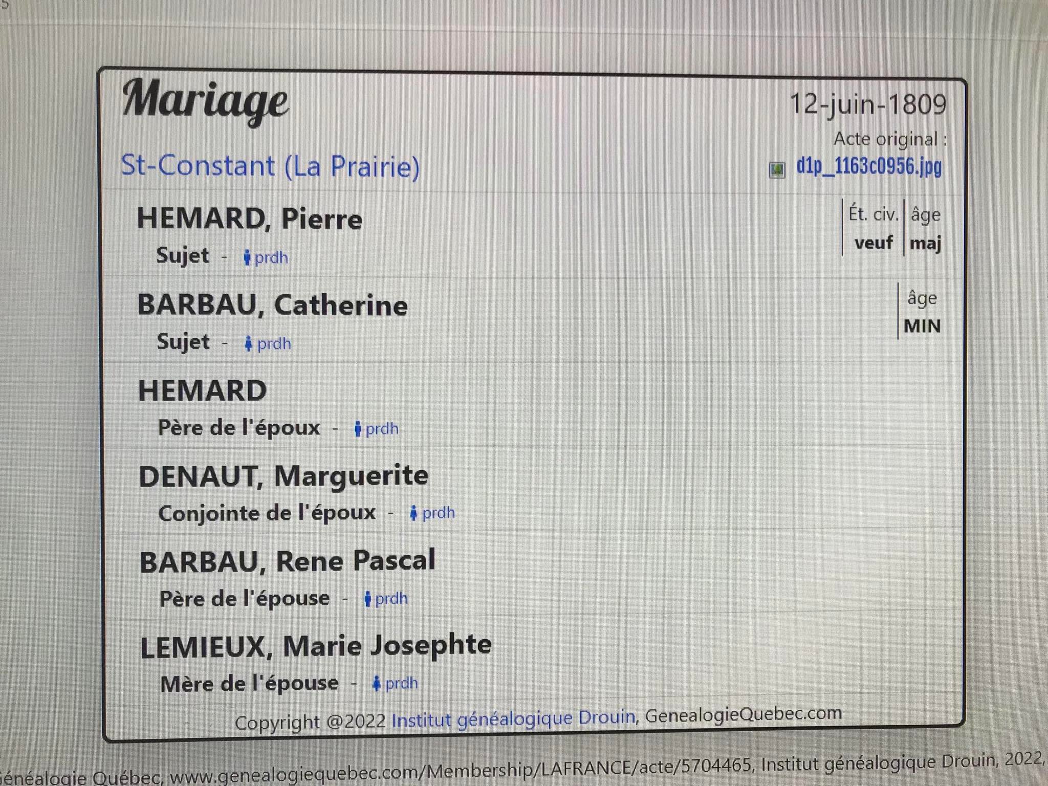 Mariés le 12 juin 1809 à St-Constant, Qué